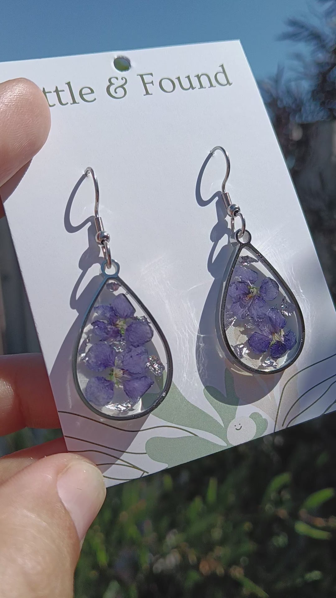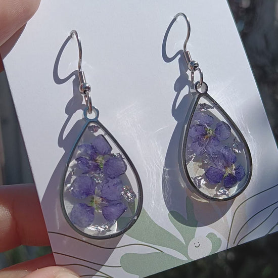 Hand picked, pressed, and set in UV resin, these earrings are all unique. All flowers are either from my own garden or from the Aussie native nursery I work at. They are lightweight in design and all have stainless steel hooks for sensitive skin.